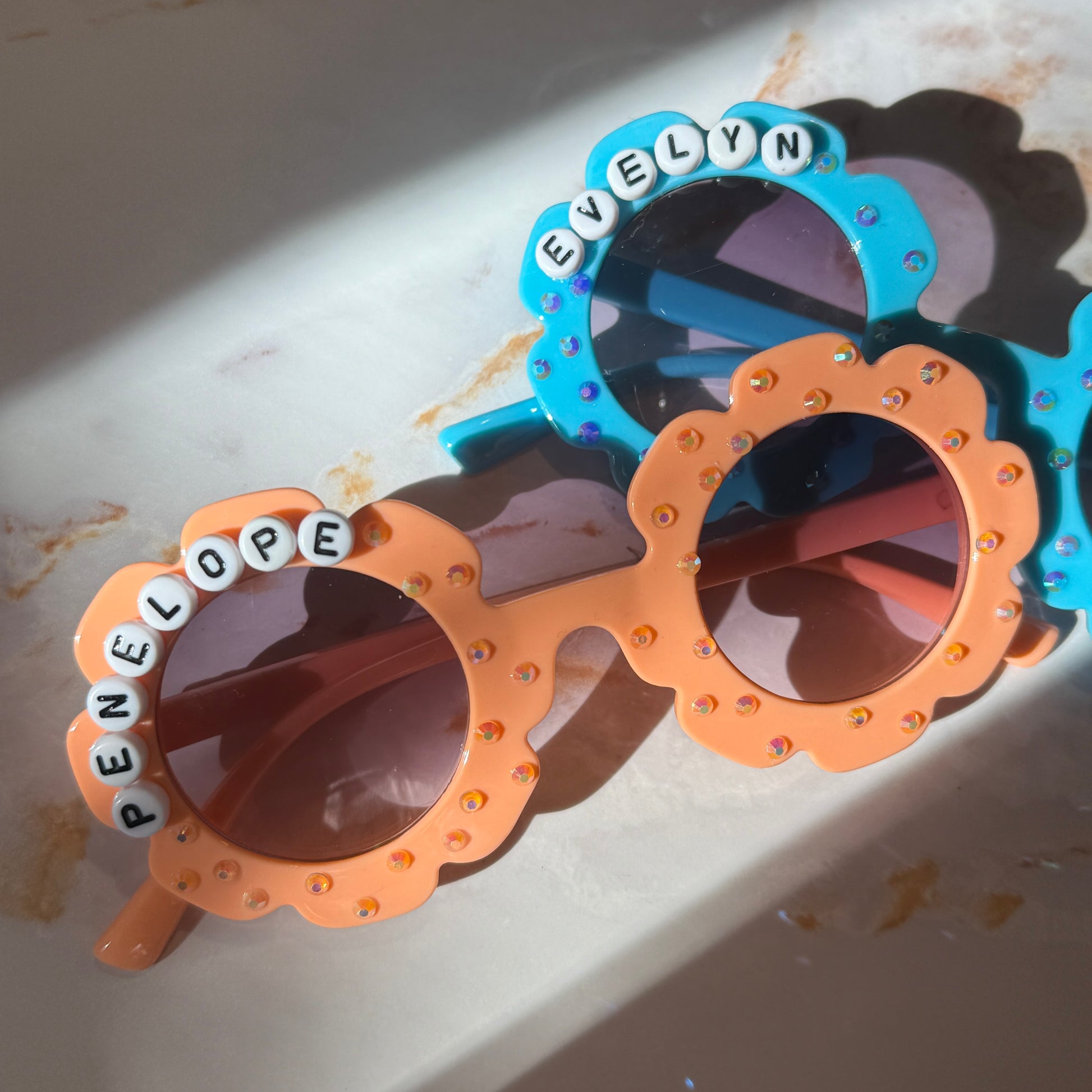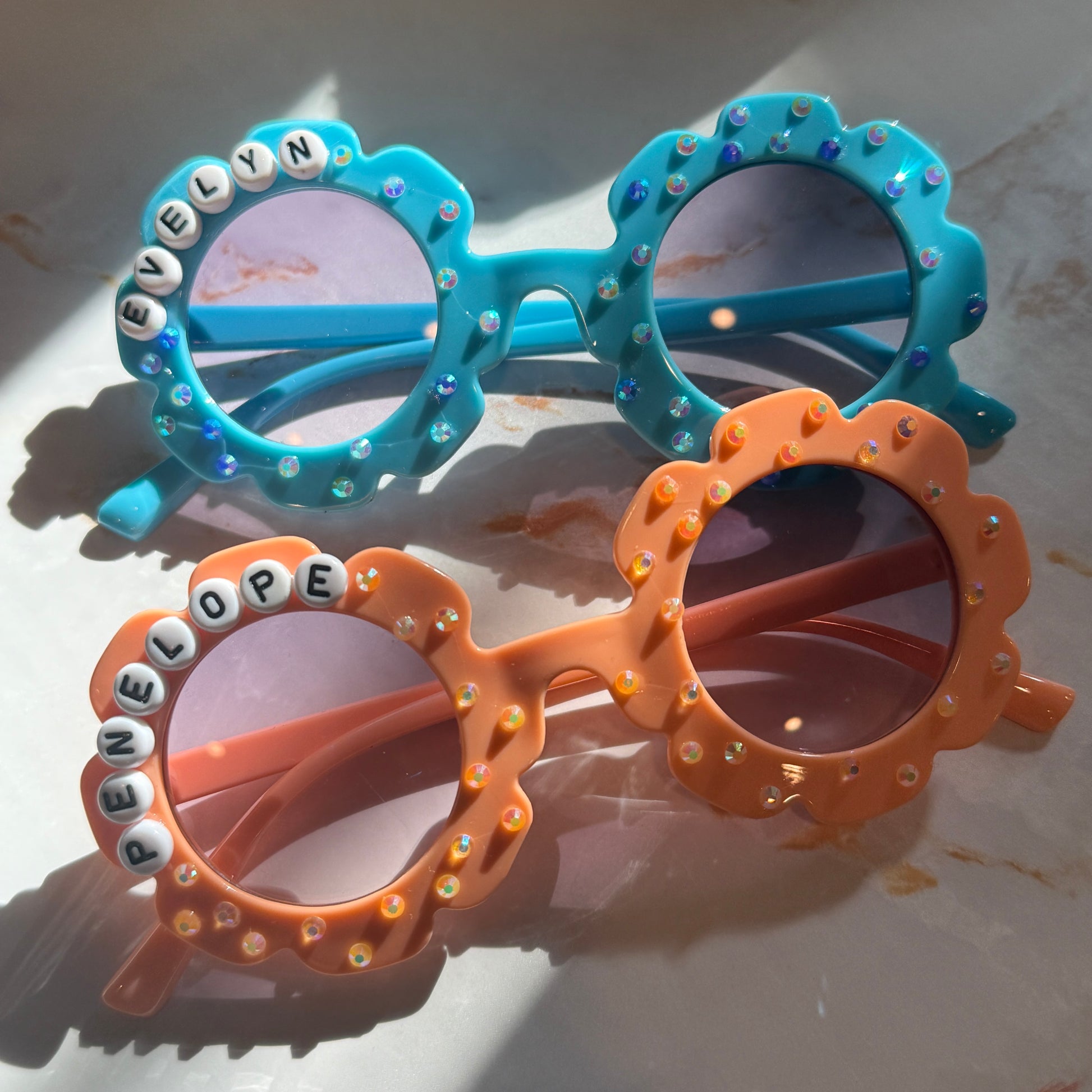 Bedazzled kids sunglasses personalized with their name. How cute are these for the Easter baskets? Name will be done in White name beads with coordinating color rhinestones. Example in Peach and Blue shown.
